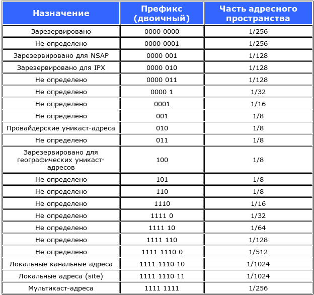 Далее приведена таблица префиксов, их назначений и части пространства, занимаемого ими: